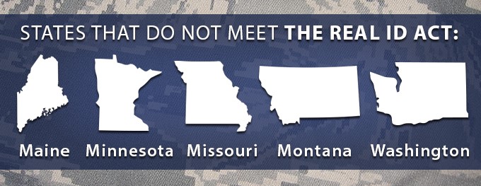 As of September 15, 2016 Sheppard Air Force Base no longer accepts the following state issued driver licenses or state issued IDs that do not meet the Real ID Act of 2005 standards for unescorted access purposes. The states that do not meet these standards are Maine, Minnesota, Missouri, Montana, and Washington. Enhanced DL/IDs from Minnesota+ and Washington+ are accepted forms of identification. In order to be issued a pass or given unescorted access to Sheppard, person(s) requesting access with one of the listed state DLs or IDs will also need to present, along with the non-compliant DL/ID, one of the documents below to prove identity:
