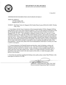 On Jan. 31, the Texas Commission on Environmental Quality (TCEQ) required Sheppard Air Force Base, Texas, to issue a Boil Water Notice (BWN). The notice informed employees of Bldg. 5 that due to a water line break that occurred on the south side of Fifth Avenue between Avenues C and D, the water