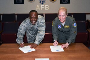 Brig. Gen. Ronald Jolly Sr., 82nd Training Wing commander and Col. Andrea Themely, 80th Flying Training Wing commander, support Sexual Assault Awareness and Prevention Month by signing a proclamation March 27, 2018. April is recognized as Sexual Assault Awareness and Prevention Month across the