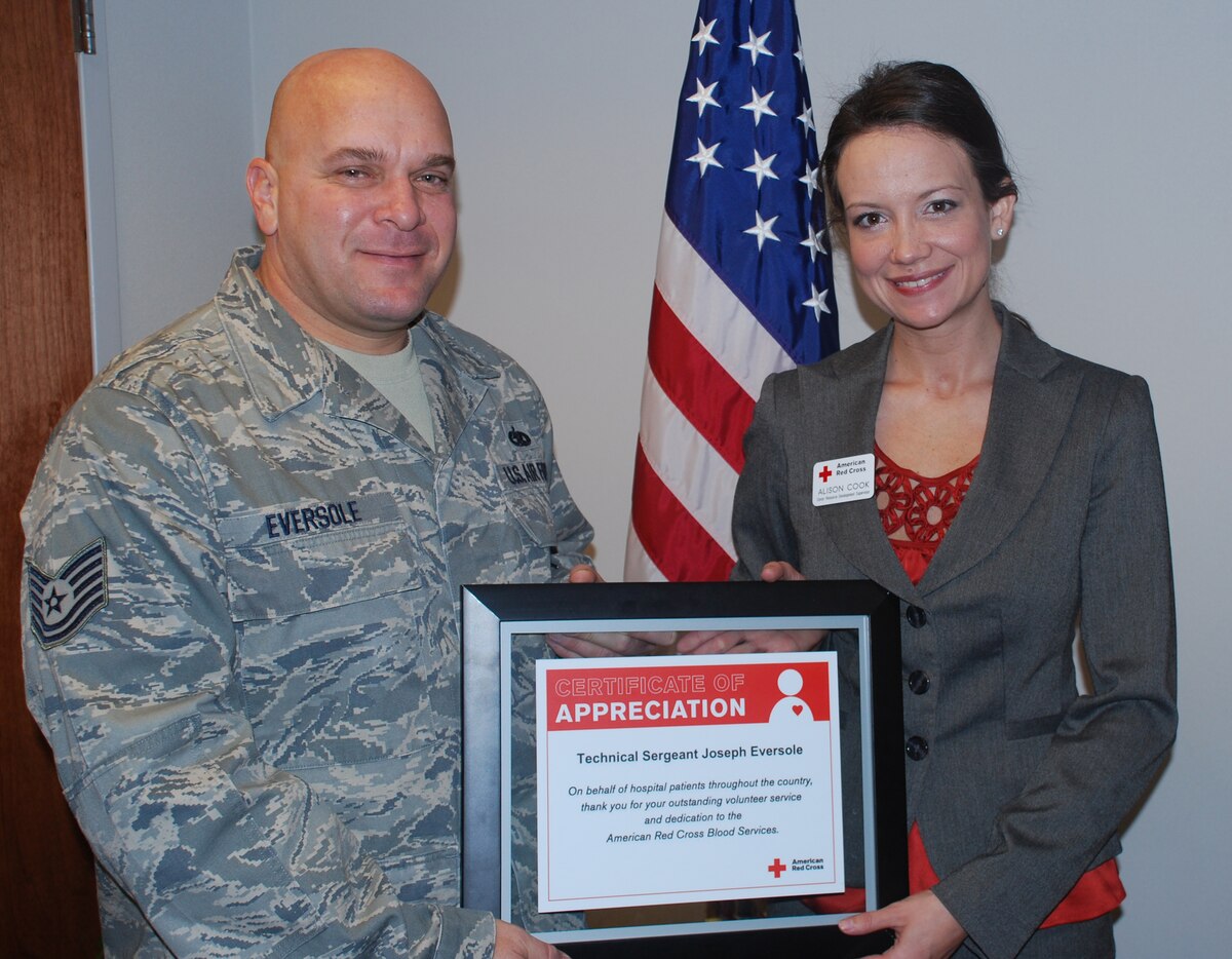 Alison Cook, right, the American Red Cross donor recruitment supervisor for Texas, presents a certificate of appreciate to Tech. Sgt. Joseph Eversole Dec. 15. The 982nd Maintenance Squadron Airman was recognized for his efforts to coordinate an event that produced enough blood to save 2,250 lives. (U.S. Air Force photo/John Ingle)