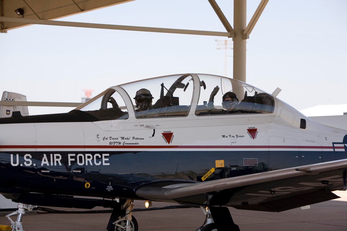 Col. David Petersen (front seat), 80th Flying Training Wing commander, and former Wichita Falls Mayor Kay Yeager taxi down the parking ramp June 24 prior to their T-6A Texan II flight. Sheppard hosted Mrs. Yeager to a public affairs flight due to her continued support of the base. Mrs. Yeager is also a member of the Chief of Staff of the Air Force Civic Commander's group. (U.S. Air Force photo/Lt. Col. Ternell Washington)