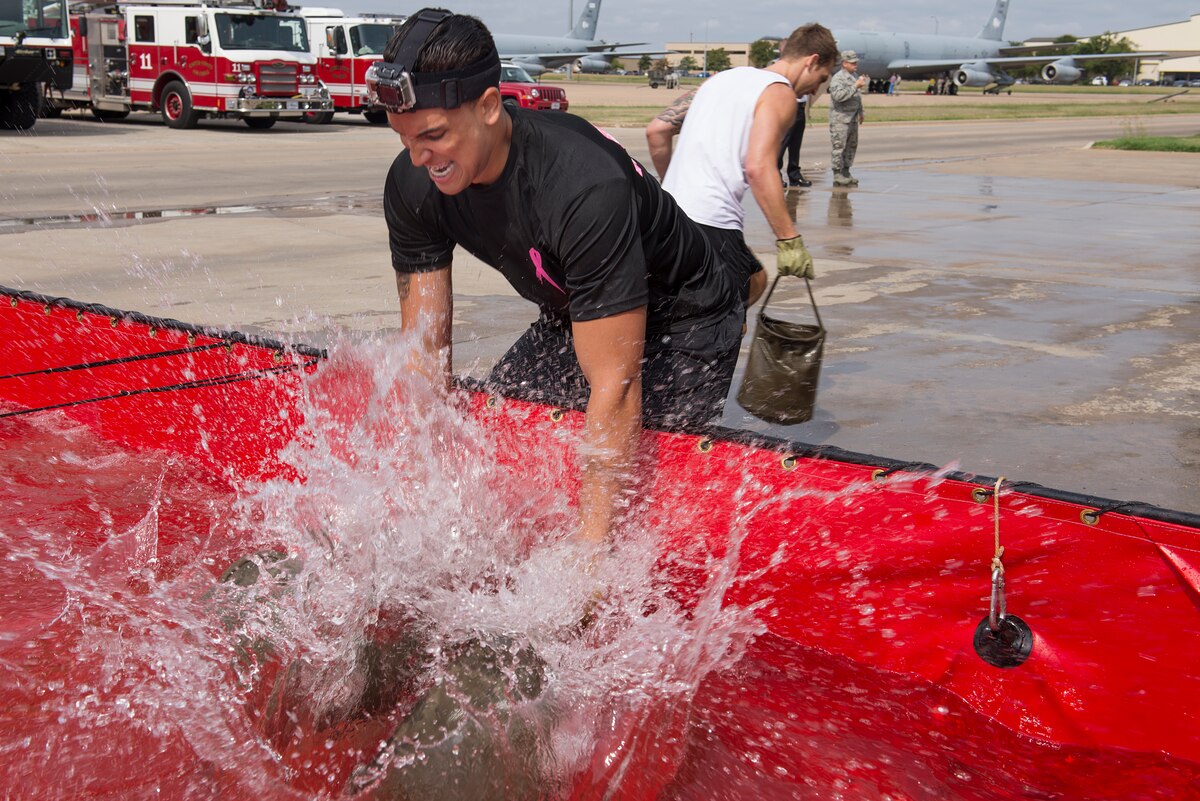 Senior Airman Nicholas Brown, 80th Operations Support Squadron air traffic controller, fills his water bags during the 6th Annual Firefighter Olympic Challenge Oct. 9, 2015. The challenge took place during fire prevention week as a means to raise awareness for fire safety and prevention. Brown's team won 1st place in the competition. (U.S. Air Force photo/Senior Airman Kyle Gese)