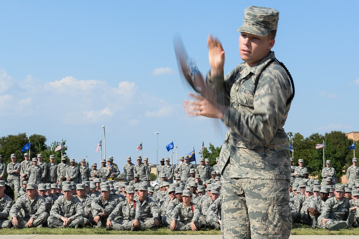 A technical training student at Sheppard Air Force Base, Texas, competes in a drill competition at the base parade grounds, Sept. 25, 2015. Drill competitions, such as this one, promote friendly rivalry and morale among the Airmen in Training. (U.S. Air Force photo/Senior Airman Kyle Gese)