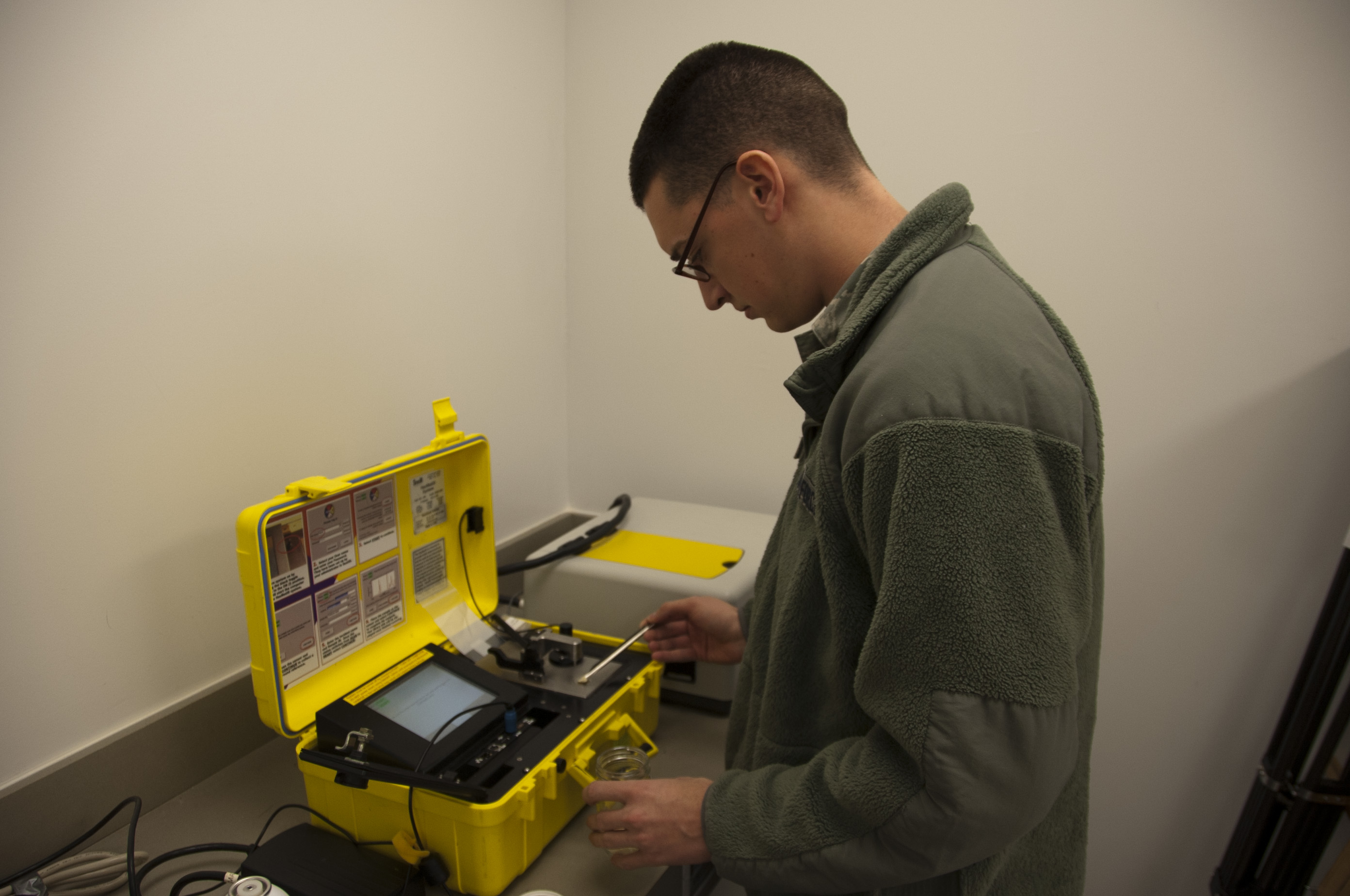 Senior Airman Casey Mowatt, 82nd Medical Group bioenvironmental technician, demonstrates his routine inspection of equipment during biomedical science corps appreciation week Jan. 27 -30, 2014. Bioenvironmental engineering is one of the 17 different specialties that are part of the bio medical science corps. (U.S. Air Force photo by Airman 1st Class Robert L. McIlrath)