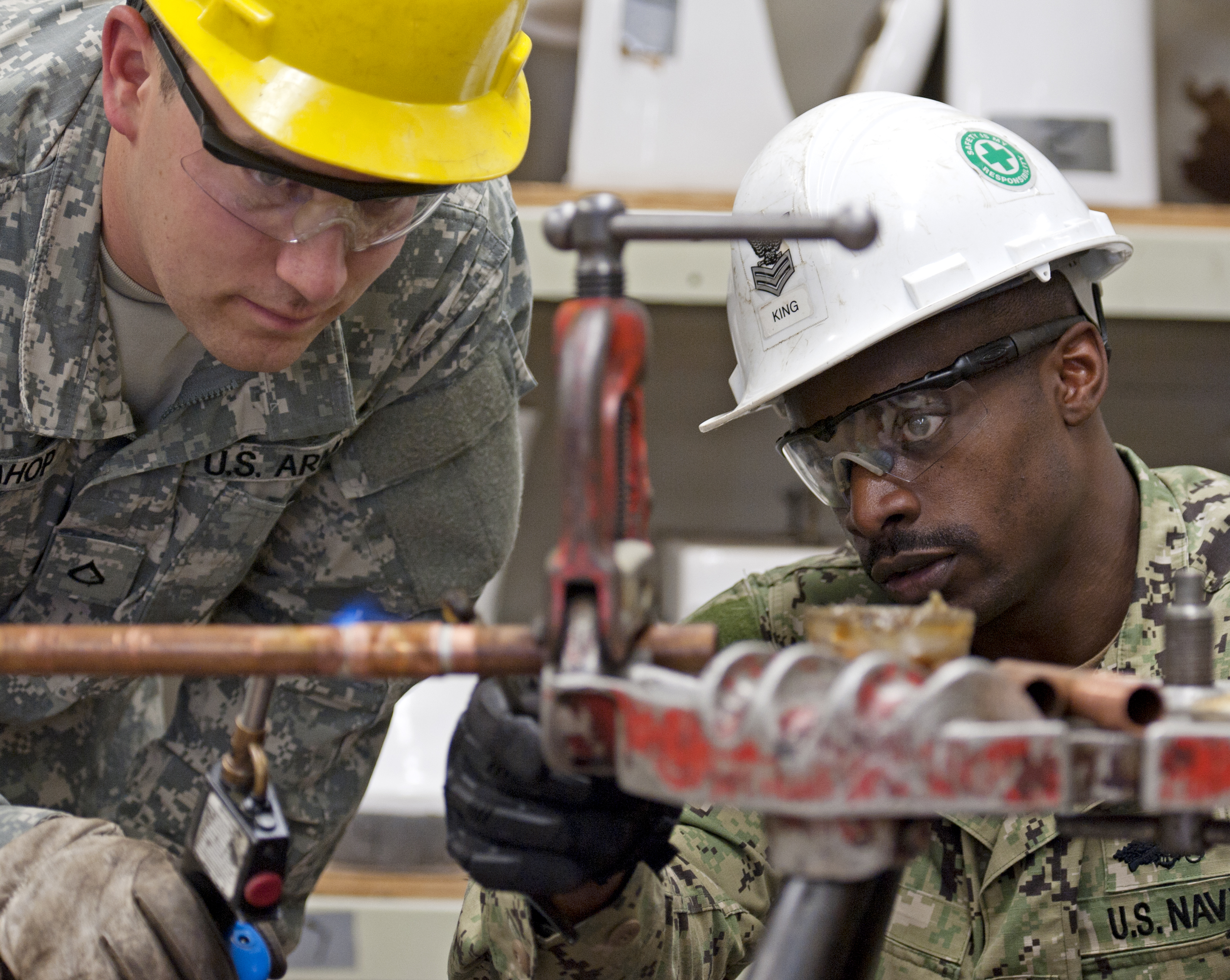 Navy Petty Officer 1st Class Charlie King, 366th Training Squadron instructor, supervises Army Pfc. Ryan Sivahop, Delta Company 169th Engineer Battalion, as he uses a blowtorch to solder copper pipe during a water and fuel systems maintenance course plumbing class at Sheppard Air Force Base, Texas, Dec. 5, 2014. Students troubleshoot plumbing systems and make repairs so all fixtures operate properly. (U.S. Air Force Photo Danny Webb/Released)
